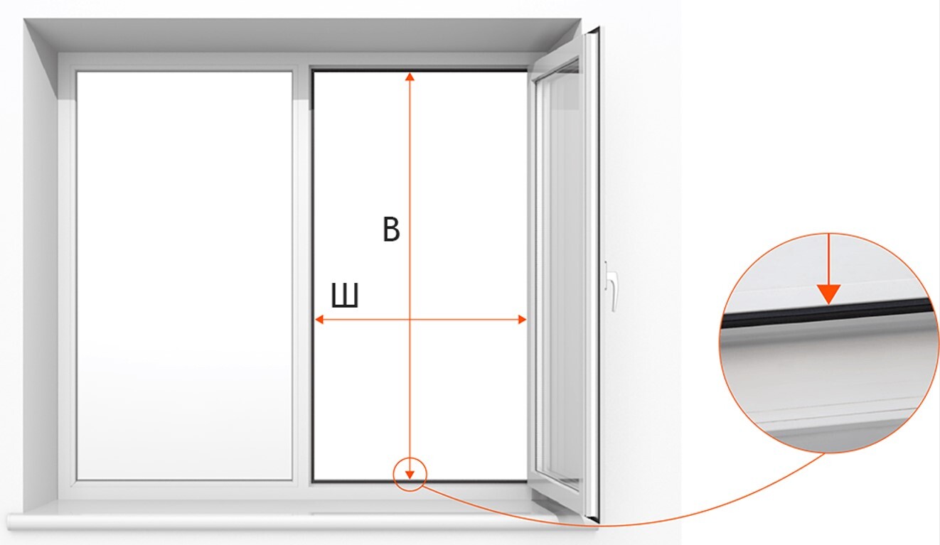Измеряем световой проем: для этого открываем створку окна и измеряем ширину (Ш, мм) и высоту (В, мм) по наружной кромке рамы окна (от резинки до резинки) как на рисунке ниже.