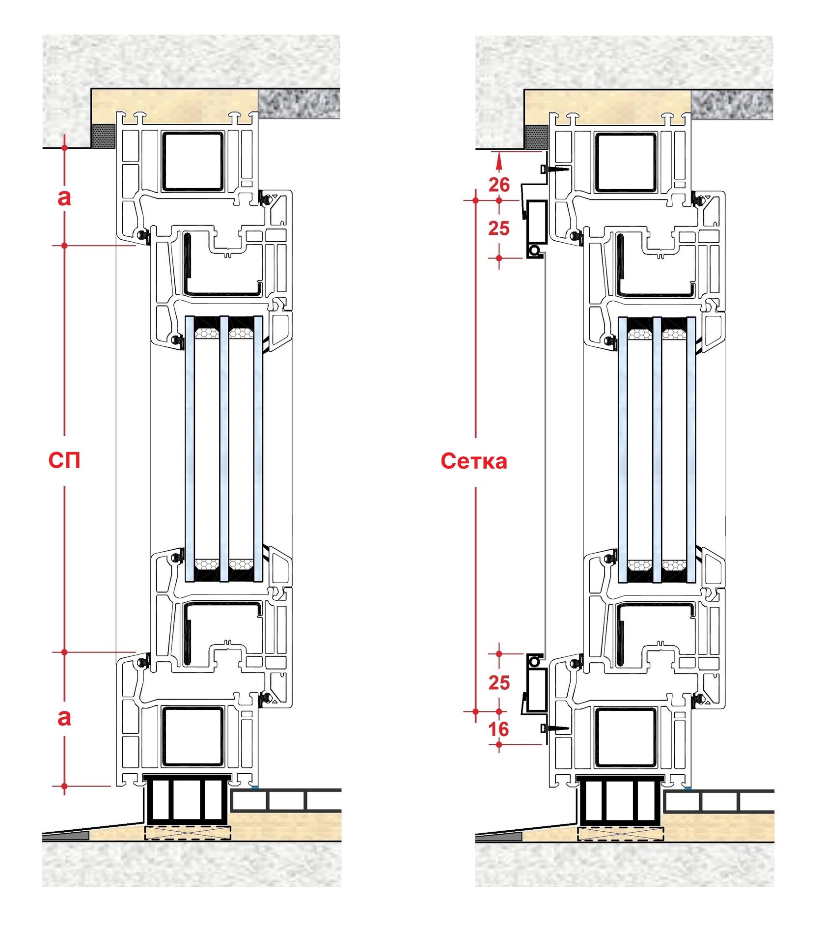 Размер сетки= Световой проем (Ш, В) + Напуск сетки на раму окна (20...50 мм). Напуск принимаем по 10...25 мм с каждой стороны (20...50 мм суммарно 2 стороны), в зависимости от свободного выступа рамы из откоса и места под установку креплений. Для Z-кронштейнов, низ нижнего крепления это нижний Напуск +16 мм, верх верхнего крепления это верхний Напуск +26 мм. При необходимости, верхние крепления можно установить по бокам сетки (ниже верха сетки на 10...50 мм), край крепления это боковой Напуск + 18 мм (над рамкой сетки должно оставаться свободное место мин. 12 мм). См. схему замера ниже: